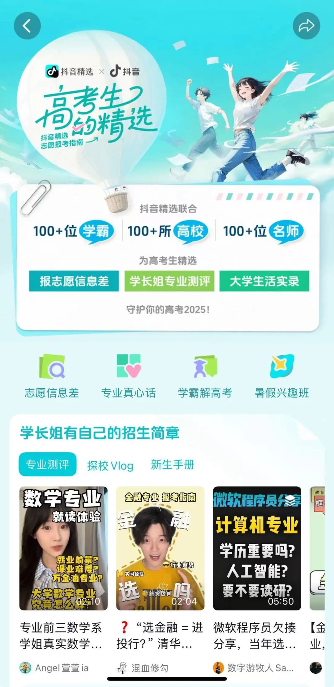 今年高考期间,抖音精选还专门为高考学生设计了专辑,集中在100张。+所高校、100 学霸、100 一位名师,守护着高考学生的冲刺。