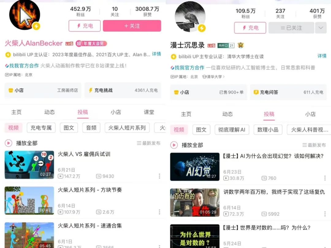 谈到火柴人AlanBecker,他创作的《火柴人VS数学》 (Math)》火柴人VS物理 (Physics)》该系列曾多次登上哔哩哔哩每周必看榜,2020年7月3日,这位专注于创作火柴人学习动画的创作者正式入驻哔哩哔哩,在YouTube平台拥有数千万粉丝的知名度。。因为火柴人系列的特点是创意和科普的结合,吸引了大量的学生观看,张告诉娱乐价值官,火柴人是她的“童年记忆杀戮” ,数学、物理、几何的启蒙也是在火柴人动画中建立起来的。另一个百万UP主@漫士沉思录,因为火柴人的知识在哔哩哔哩很受欢迎。