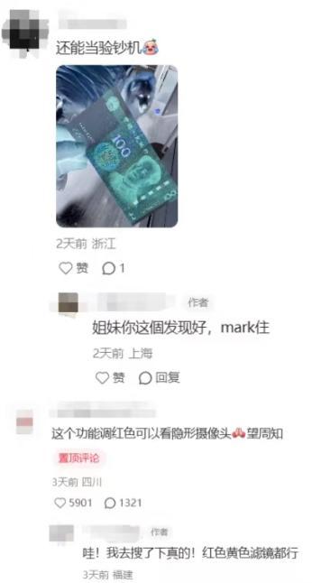 许多网民的创造力可不止于此,有人举一反三,将此功能转移到验钞上,调成红色滤镜后还可以检查隐形摄像头。