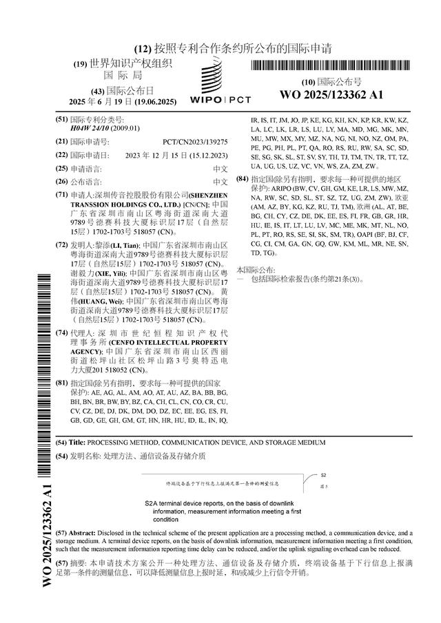 据证券之星消息,根据企业调查数据,传音控股(688036)公布了一项国际专利申请,专利名称为“处理方法、通信设备和存储设备”,专利申请号为 PCT国际公布日为/CN2023/139275 2025 年 6 月 19 日。