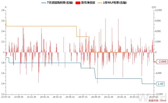 中央银行宣布,7 月 2 日以固定利率、数量招标方式进行 985 亿元 7 天期逆回购操作,操作利率 投标量为1.40% 985 亿元,中标量 985 亿元。Wind 数据显示,当天 3653 逆回购到期1亿元,由此计算,单日净回笼 2668 亿元。