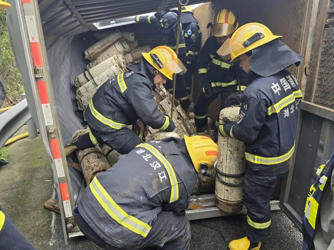 经确认,所有乙炔钢气瓶均无泄漏,消防队员将气瓶移至安全区域,联系相关专业车辆运输。经过紧张处理,危险情况被成功排除。据了解,在货运司机运输过程中,车辆右后两个轮胎爆胎,导致侧翻事故。