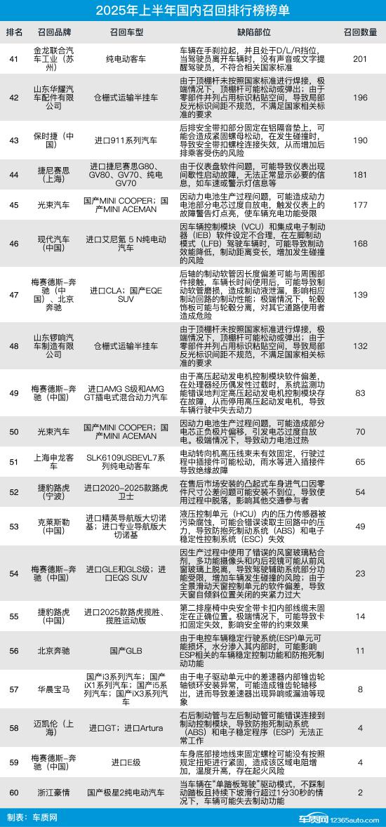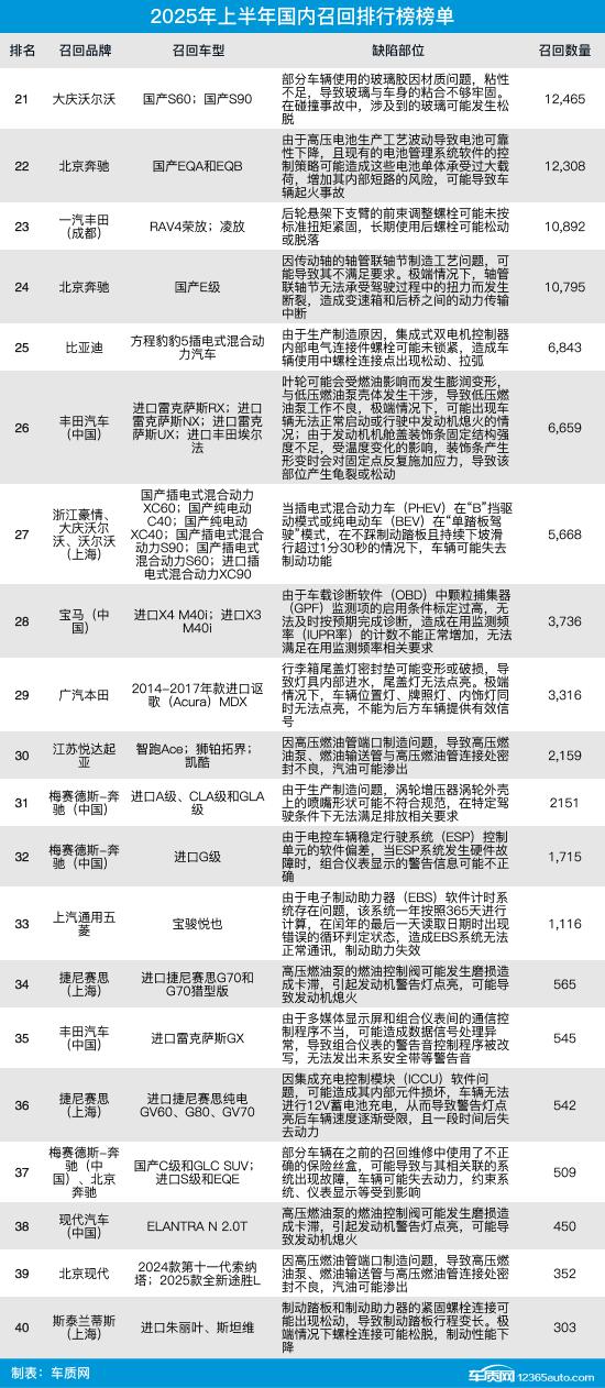 相比 2024 年上半年,2025 2008年同期,召回活动次数明显减少。其中,丰田因“低压燃油泵故障”召回了部分进口雷克萨斯车型,奔驰召回了少量国产车型,因为“轮毂装饰板可能与轮毂分离”。 EQE SUV 车型,两个品牌的召回次数都是二位数。扩大召回频率和数量大幅减少,反映了汽车质量控制体系的深刻变化。从“被动补救”到“主动预防”,汽车公司通过技术手段不断提高商品缺陷识别的准确性,尽可能提前识别缺陷节点,确保通过召回一次性解决问题,有效防止遗漏。