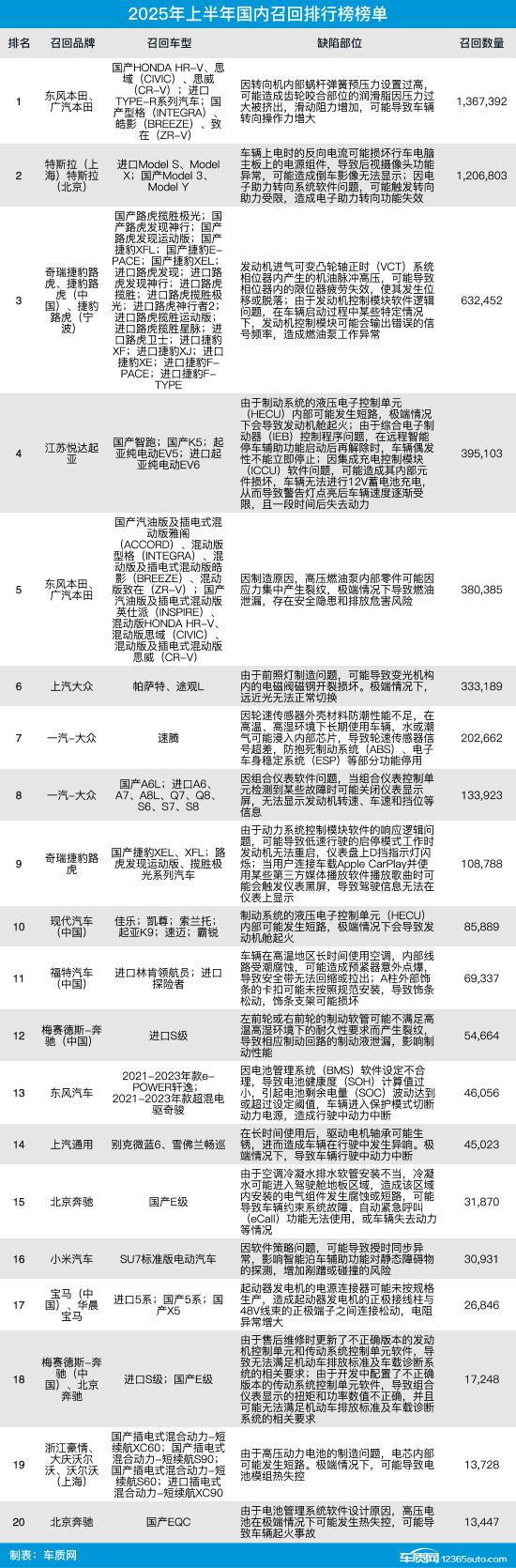 为了让客户更清楚地了解上半年国内召回的情况,车质网整理了国家市场监督管理总局的公告,并根据召回的数量从大到小进行排序,最终获得以下排名: