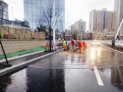 西青区城管委紧急调度防洪车辆,确保防洪团队全体员工到岗,针对柳口路隧道、胜利路隧道、建设隧道等防洪重点点。外置布置关键点位置 6 闪烁的警示灯,30 个防撞桶、50 个路锥及 20 隔离护栏等防洪材料,构建“人防” 防御性“双重保障系统”,全力防止“小水淹车”等局部短期强降雨可能造成的危险。及时调整环卫作业方式,用人工推水、洗路车收水等形式清理因路面坑洼不平等造成的小面积水点。