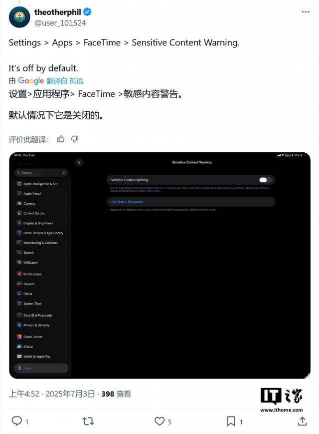 IT 世家援引博文介绍,苹果公司提供的通信安全功能之一就是干涉 FaceTime 视频聊天中的外露内容,不过以前主要适用于儿童,另外还会模糊地处理“照片”应用中的共享相册中的外露内容。