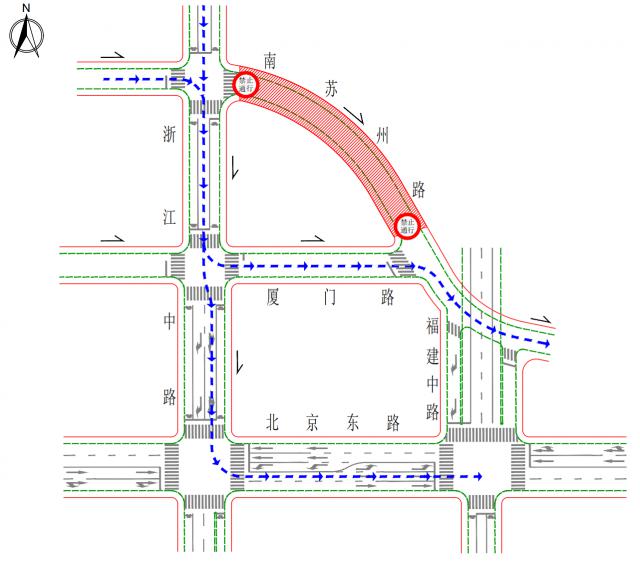 7 月 4 日夜起南苏州路(浙江中路) - 厦门路)将进行封闭围栏施工,施工路段将采取全天禁止车辆和行人通行的控制措施,工程结束后将恢复原交通组织。受上述交通组织调整的影响,车辆和行人在施工过程中可以通过厦门路和北京东路相应绕道。
