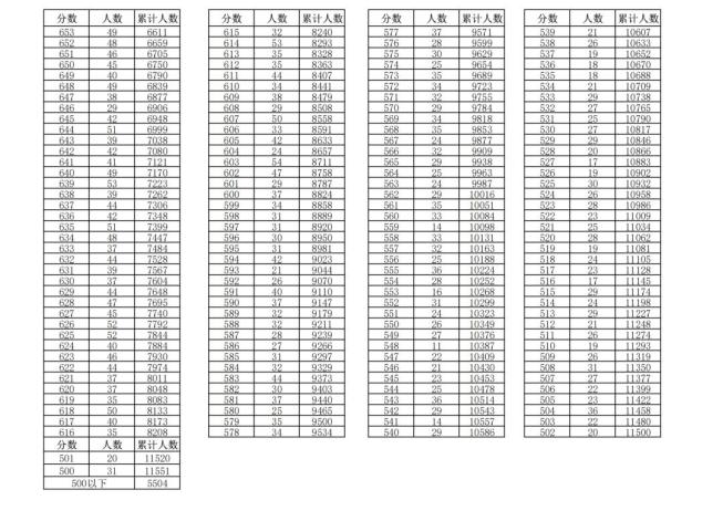 今年,该市共有17055人报名参加中考,比去年增加了605人。和去年一样,今年的中考总分仍然是850分。从一分一段的分档表来看,801分以上(含801分)的考生有138人,701分以上(含701分)的考生有4266人。