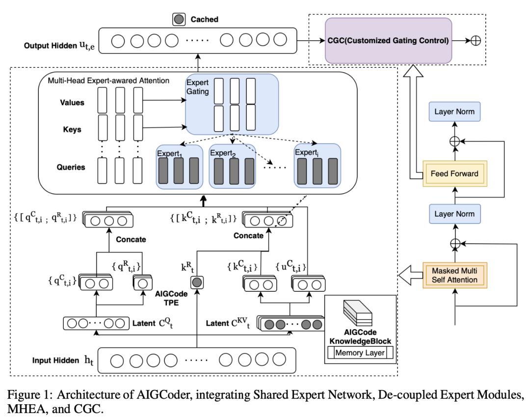 通过解耦专家模块,蔻町智能开发的AIGCoder架构图,通过解耦专家模块。(De-coupled Experts)改进传统模型,利用双头专家感知注意力(MHEA)负责动态激活专家,定制门控制(CGC)在不增加计算费用的情况下,负责对信息进行精细整合,通过架构创新来应对大模型拓展所遇到的瓶颈。
