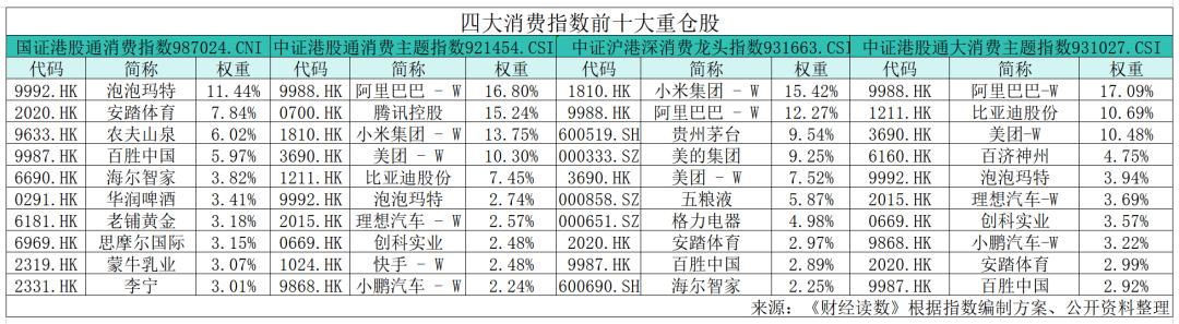 上表为四大消费指数前十大重仓股明细。从上表可以看出,泡泡玛特在国证港股通消费指数中占比最高,达到11.44%,其他三个指数占比低于4%。