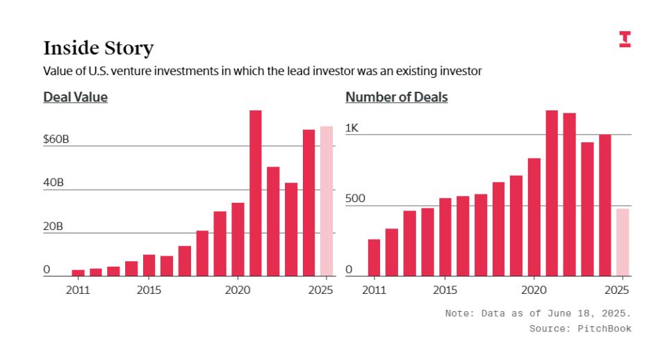 根据硅谷数据研究机构PitchBook的统计,截至6月中旬,由当前投资者领导(Insider-Led Rounds)初创企业的融资总额已经超过了690亿美元,这一数字不仅超过了去年的融资总额(670亿美元),预计将突破2021年零利率阶段创下的历史最高纪录。