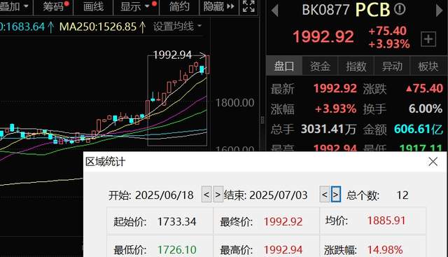 自6月18日以来,在AI需求的刺激下,PCB概念一直处于破竹状态,该板块累计上涨14.98%。