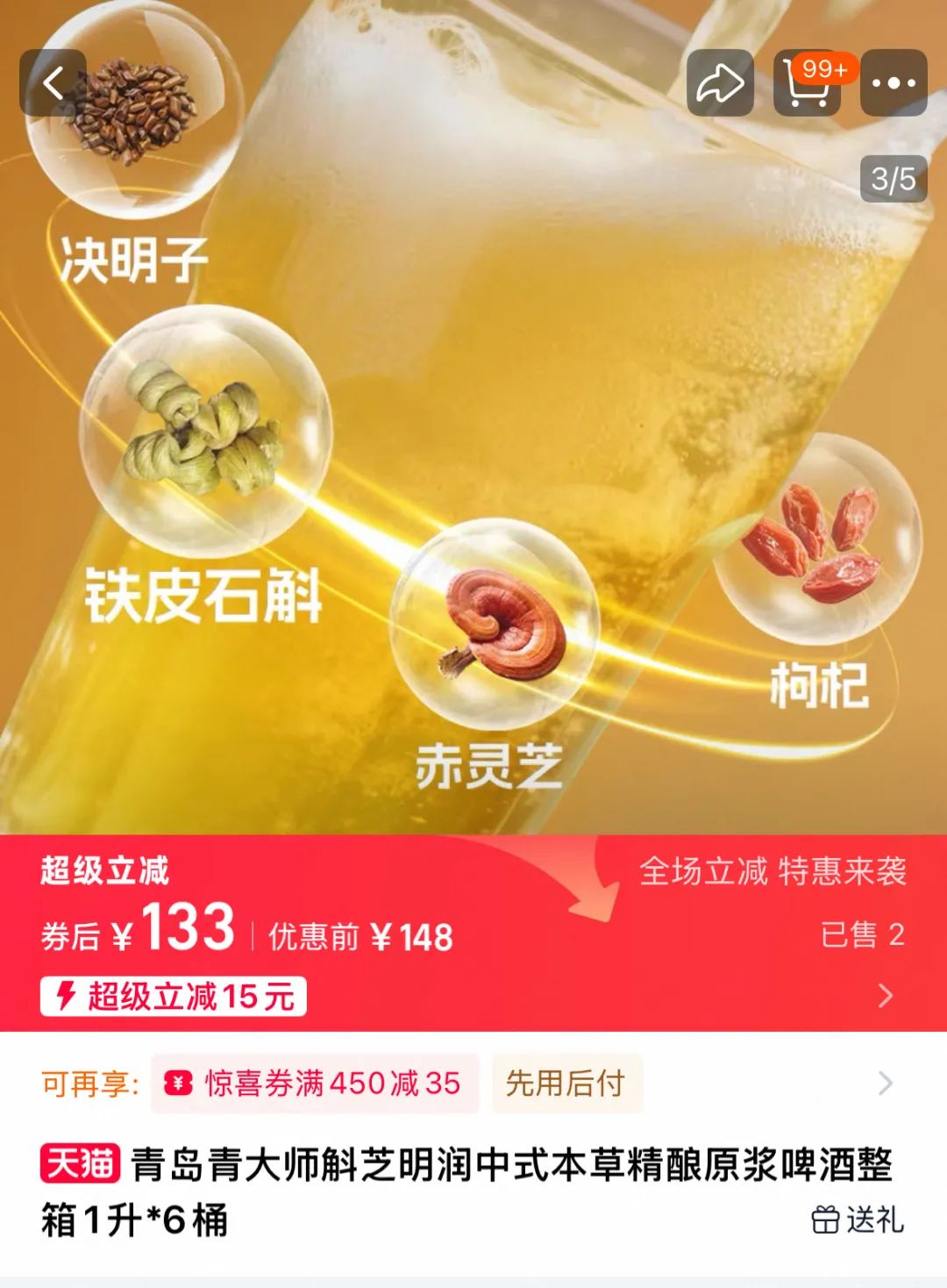 就在线渠道而言,“中式啤酒”的口味更加丰富。7月4日,中新经纬在一家电商平台上搜索“中国啤酒”,跳出了很多商品,其中金星啤酒推出了一系列“中国工艺”,包括陈皮、百香果、绿豆、荆芥、冰糖葫芦、生椰子拿铁等口味;青岛啤酒也有“醉樱浮白樱花白啤酒”。此外,该品牌还推出了“中式本草自酿啤酒”,其中一款“斛芝明润中式本草精酿”,加入了决明子、铁皮石斛、赤灵芝、枸杞等中药材,折价133元,共6罐,约22元/罐(1L)。