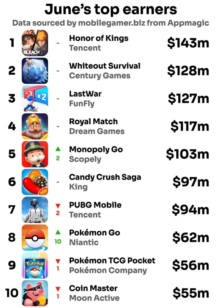 六月份全球手游收入Top20:点点2冲出,绝区零第19,鸣潮第20