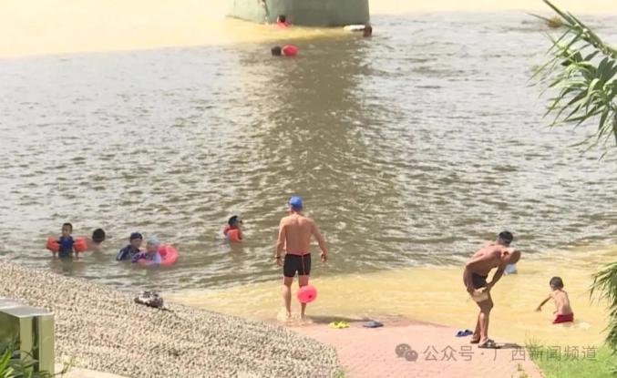 很多儿童戏水出现在南宁邈江边。