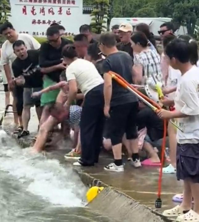 在激流中,大家一起拉回了坠河男孩。