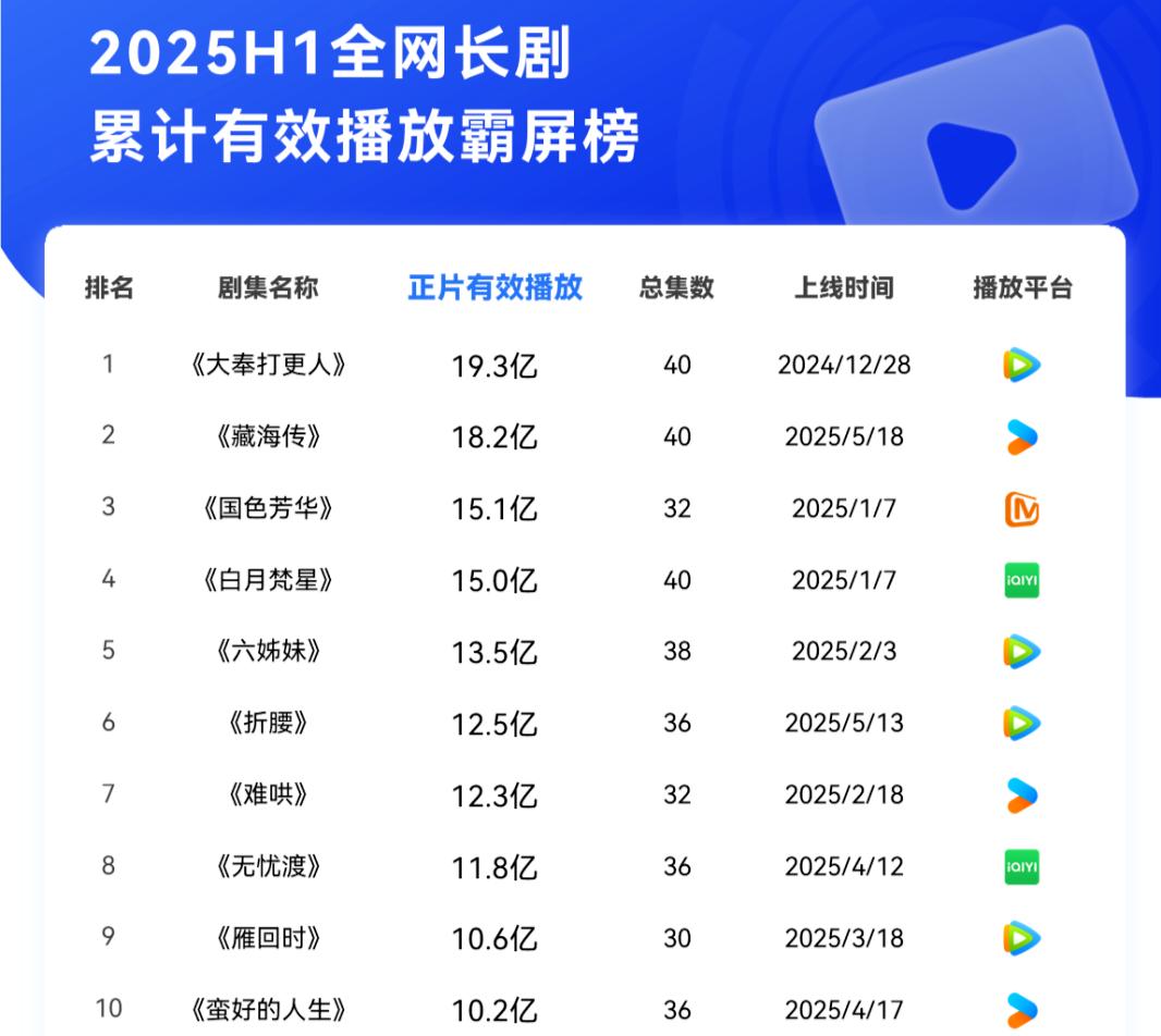资料可能更直观。据云合数据显示,2025H1全网剧累计有效播放前三名是《大奉打更人》、《藏海传》和《国色芳华》,整部电影有效播放分别为19.3亿、18.2亿和15.1亿,而去年19.3亿这一数字只能排在第五位。《漂白》分别以5490万和3155万分别获得第一名,而去年,《与凤行》的6597万和《新生》的5190万分别是《与凤行》的6597万和《新生》的5190万。