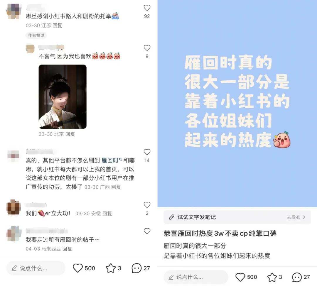 在女性群体与女性话题的高度匹配下,小红书成为了黑马剧《雁回时》的“娘家”,让更多的电视剧制作人和平台看到了小红书社区的“独特性”。