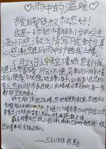 “你的脚步声在狭窄的楼梯上回荡,每一步都是坚定而有力的……”一封手写的感谢信,五段200多字,警察李良献背着他上学的身影出现在陈骁同学稚嫩的字迹上,他很努力,很温暖。