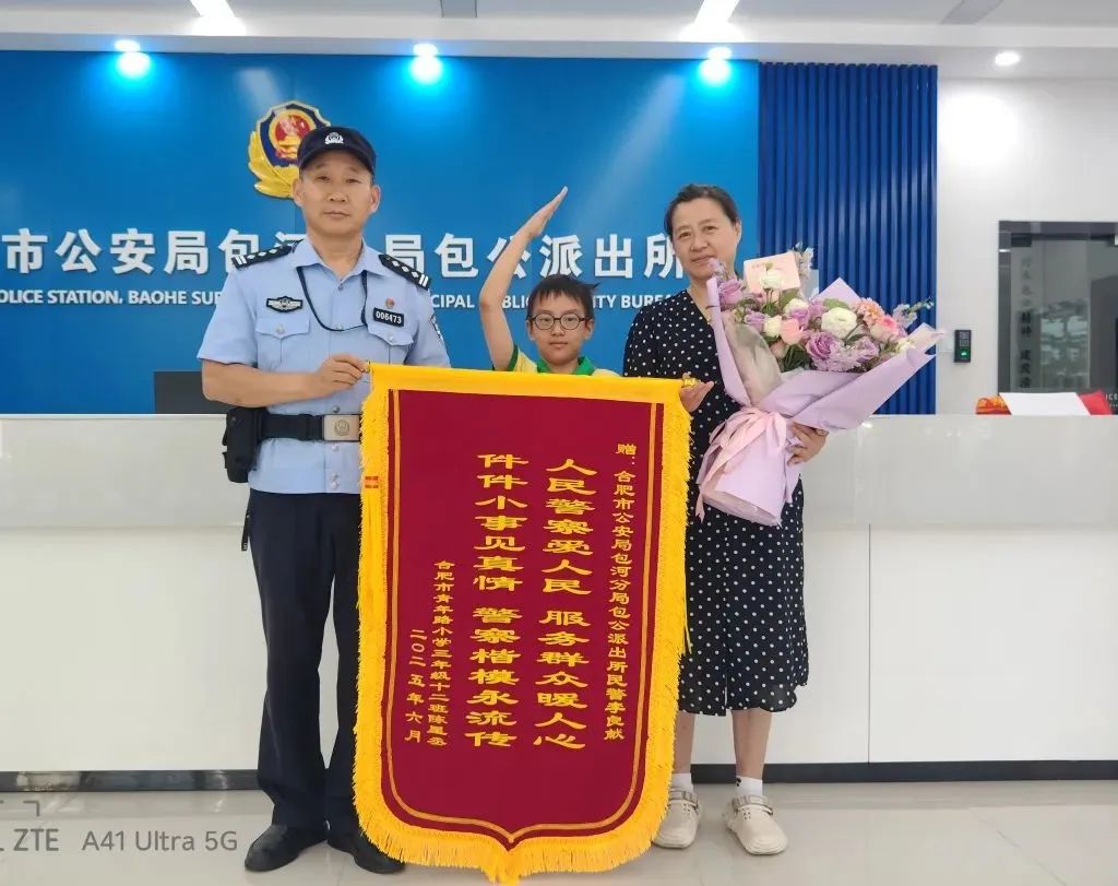 “谢谢你叔叔背着我上楼。”在外婆的陪同下,合肥市青年路小学生陈骁特意来到合肥市公安局包河分局包公派出所,向民警李良献赠送了一封手写的感谢信、横幅和鲜花。