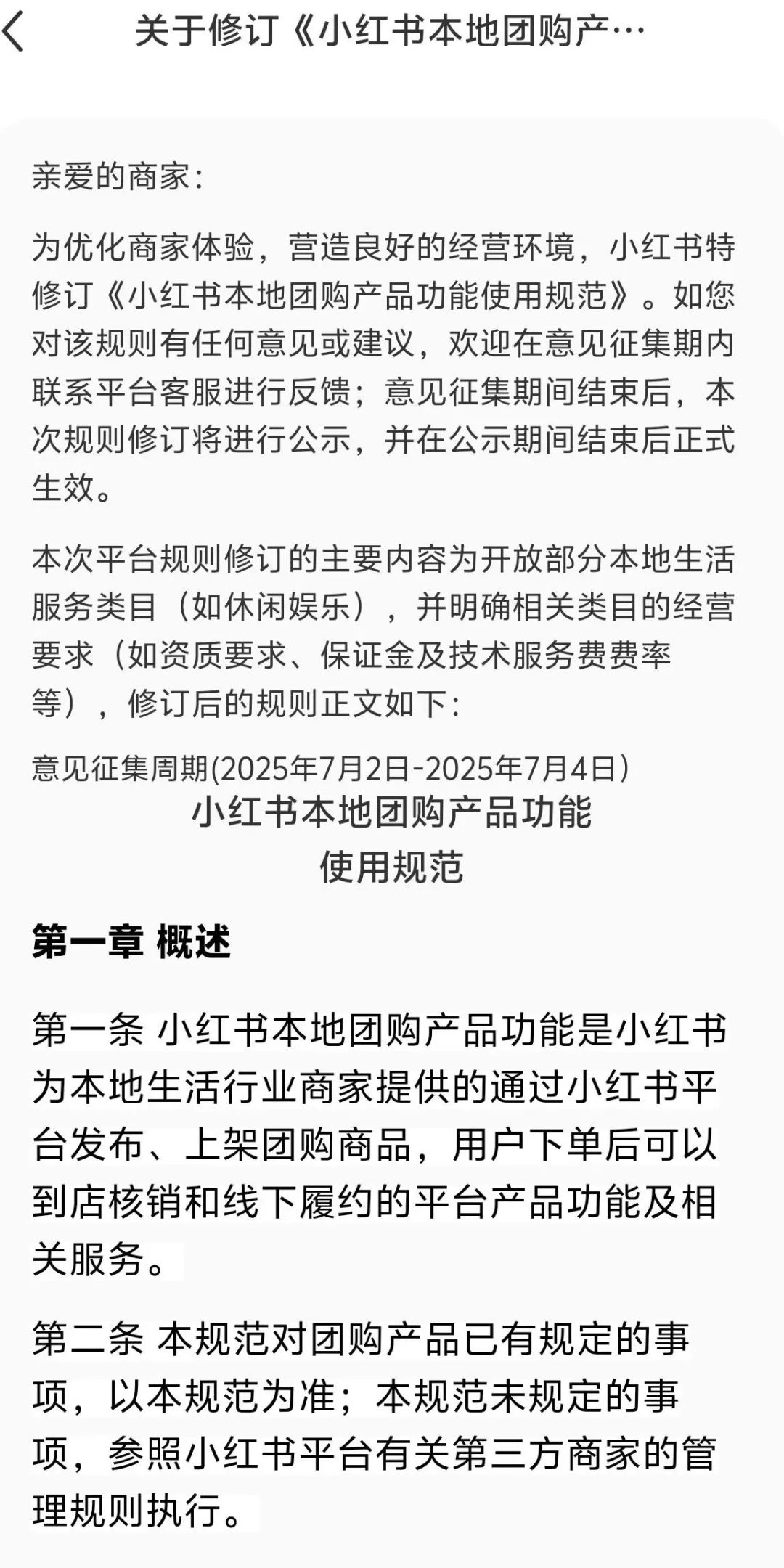 近日,小红书发布了关于修订《小红书本地团购产品功能操作规范》的建议征集通知。