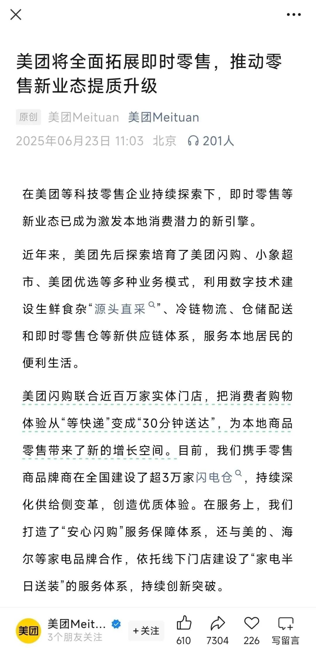 即使地位难以撼动,美团也没有躺在过去的成就上。6月23日,美团正式宣布将全面扩大即时零售,推动新零售业态升级。具体来说,美团将调整升级其运营模式,如美团闪购、大象超市、美团优化等。