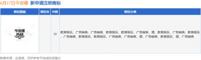 证券之星消息,根据天眼查 APP 数据显示,江苏今世缘酒业股份有限公司近日新递交 20 商标申请。商标申请的详细信息如下: