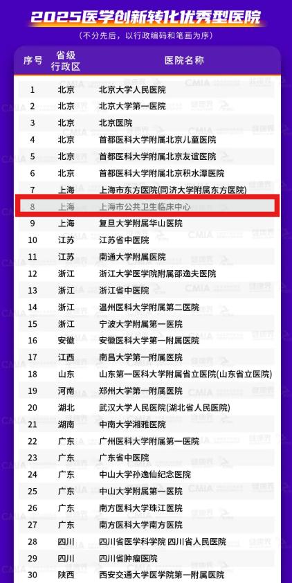 2025年6月27-29日,第七届 CMIA 青岛隆重召开医学创新大会。会议发布了《中国医院创新转型报告(2025)》,公布了2024年中国三甲医院创新转型成果的“成绩单”。上海市公共卫生临床中心获得2025年优秀医院医学创新转型称号。