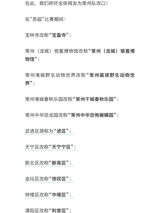 到处写建议,让寓意不好的景点和区域在苏超期间暂时更名。什么宝林寺,保零寓意很差。再比如武进区,武进不是没有进步。淹城的动物世界和天堂也被盯上了。就因为 " 淹 " 字太水。