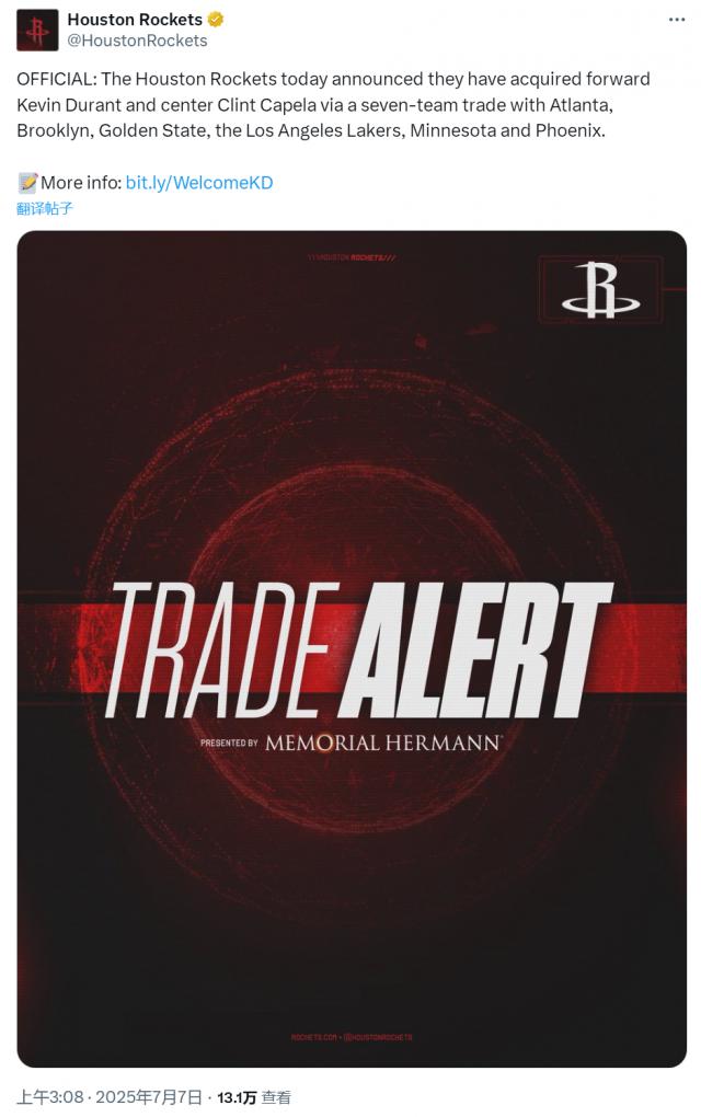 北京时间7月7日凌晨3点,休斯顿火箭官方宣布,通过一笔涉及7支球队的大交易,正式得到凯文 - 杜兰特和克林特 - 卡佩拉。此次交易中火箭得到的球员不变,不过把杜兰特的交易范围扩大到了7支球队,湖人、勇士均参与其中,这可是NBA首次出现7队大交易。