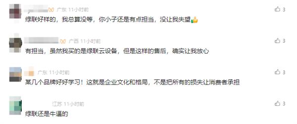 对于绿联的这一举措,有网友评价:“你小子还是有点担当,没让我失望”“某几个品牌好好学习!这就是企业文化和格局,不是把所有的损失让消费者承担”。