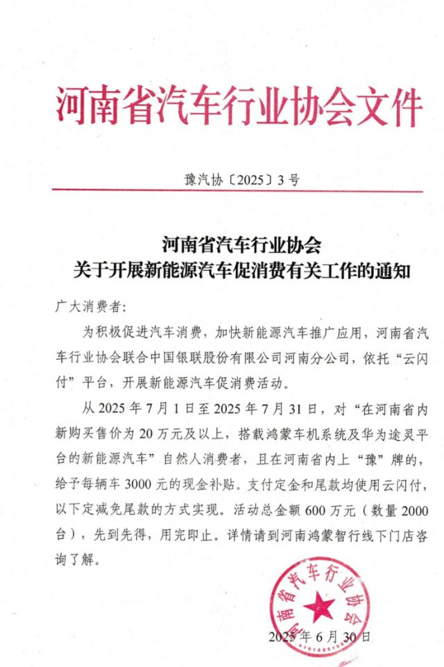 2025年6月30日,河南省汽车行业协会发布通知,开展新能源汽车促消费活动。每辆车给予3000元现金补贴,数量2000台,共计600万元,先到先得,用完即止。购车时间限定在7月1日 - 31日。