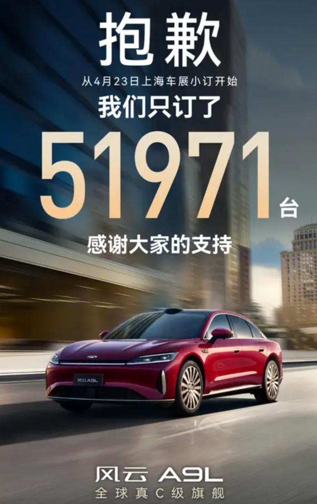 此后,奇瑞汽车推出道歉海报,称风云A9L从4月23日首发亮相到6月26日开启预售,只拿到了51971台订单。