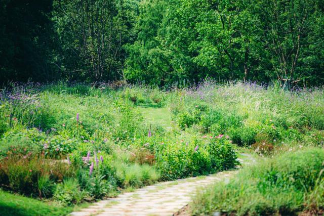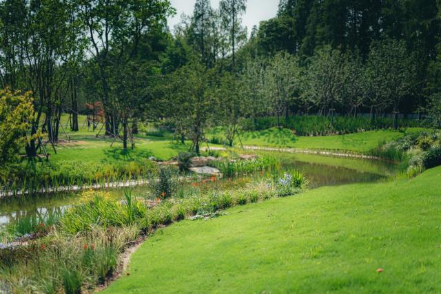 新开挖蜿蜒水系,沿岸种植乌桕、池杉等乔木,搭配菖蒲、千屈菜等水生植物,形成水岸相依的生态景观,提升生物多样性。