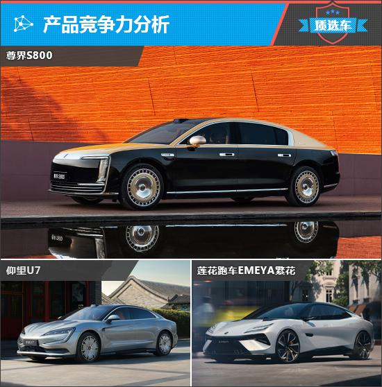 由于2025款尊界S800定位为大型车,提供增程和纯电两种动力,所以此次对比选择的车型分别是2025款仰望U7和2025款莲花跑车EMEYA繁花(下文简称EMEYA繁花)。在车身尺寸上,尊界S800在长度、高度和轴距方面领先,而宽度上EMEYA繁花表现更好。