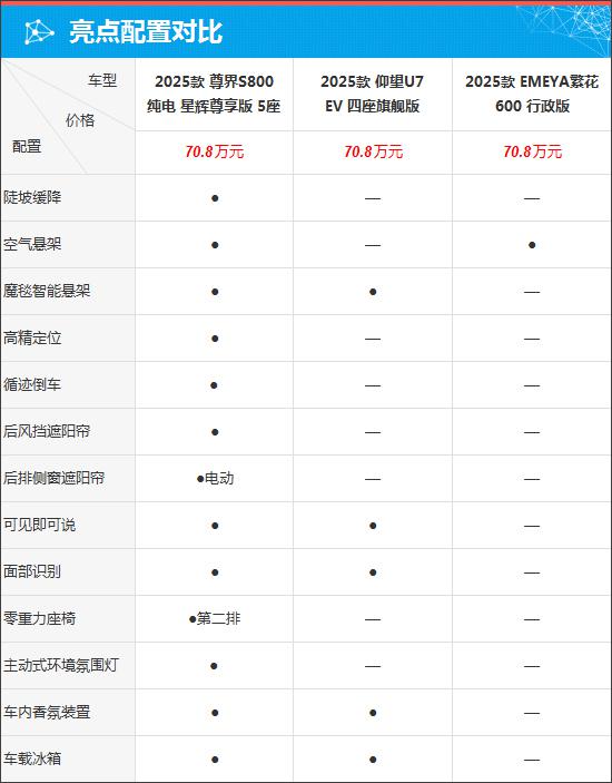 具体到车辆配置,通过对比可知,尊界S800与仰望U7整体表现较好,都提供了魔毯智能悬架、面部识别、车内香氛装置以及车载冰箱等功能。此外,尊界S800还配备了空气悬架、后排侧窗电动遮阳帘、第二排零重力座椅以及主动式环绕氛围灯等配置,车内高级氛围和舒适性体验更优。