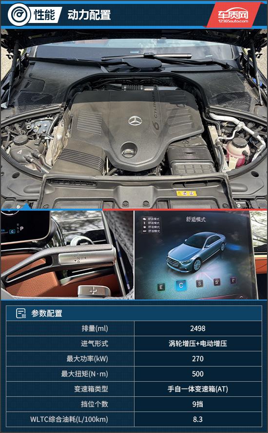 评测车搭载2.5T直列六缸发动机和48V轻混系统,最大功率270kW,最大扭矩500N · m,匹配9速手自一体变速箱,搭载4MATIC全时四驱系统,零百加速5.6秒。