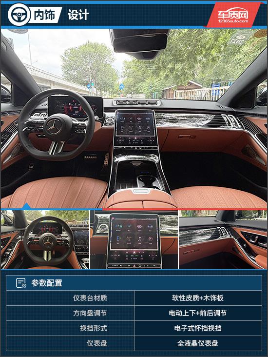 奔驰S级的内饰氛围感一直令人信服。评测车延续游艇式座舱设计,仪表台“天工藏锋”设计的飞桥式木饰板搭配Nappa真皮与精致缝线,豪华质感十足。12.3英寸液晶仪表引入裸眼3D显示技术,可根据驾驶者头部位置动态调整视角,带来有纵深感的3D视觉效果,结合HUD抬头显示,车辆信息一目了然。