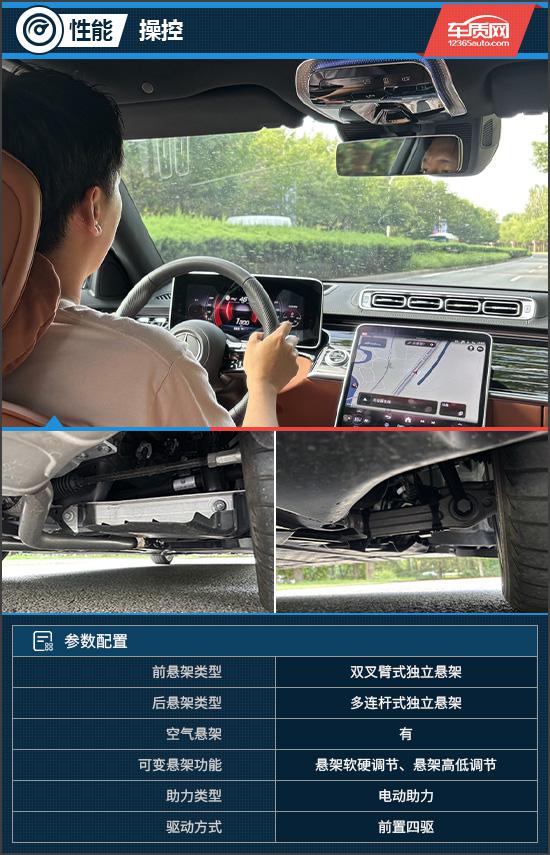 舒适模式下,评测车转向手感轻盈。可变转向比和双向4.5 °后轮转向技术让大车也能灵活穿梭于狭窄街道。空气悬架系统应对细碎颠簸时阻尼柔和,处理震动干净;激烈工况下主动增强支撑力,确保车身姿态稳健。