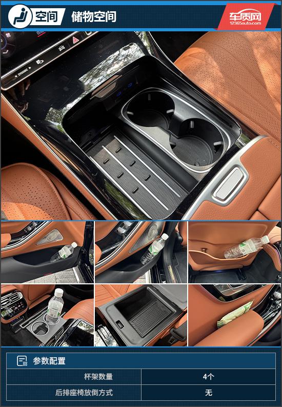乘坐空间方面,身高180cm的体验者调整好前排座椅后,前后排横向和纵向空间都很充裕。后排座椅支持前后、靠背和腿托电动调节,后排右侧还有可伸缩脚踏板,舒适性顶级。