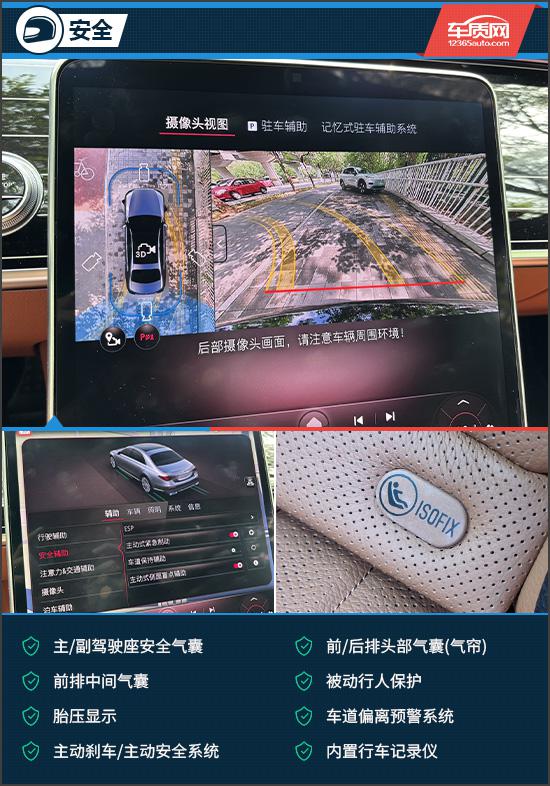 评测车配备了丰富的主/被动安全配置,如主/副驾驶座安全气囊、前/后排头部气囊(气帘)、前排中间气囊、车道偏离预警系统、内置行车记录仪等。PRE-SAFE预防性安全系统可在危险发生前通过一系列操作降低乘客受伤风险。