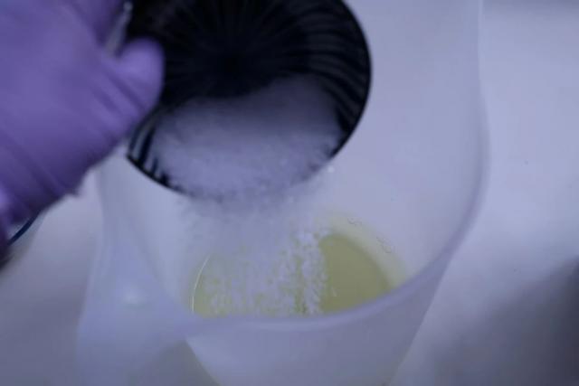5. 在蛋清中加入白砂糖,打发至小弯勾状态,然后分两次加入抹茶蛋黄糊中。