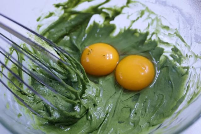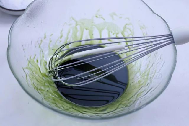 1. 将抹茶粉加入食用油和糖粉,搅拌乳化。