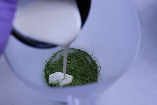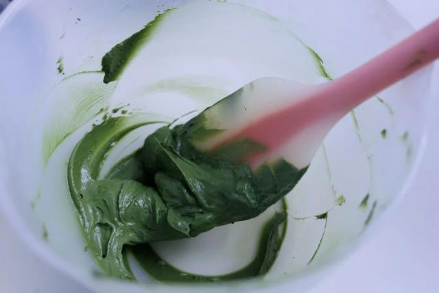 3. 把淡奶油倒入抹茶粉中,搅拌均匀。