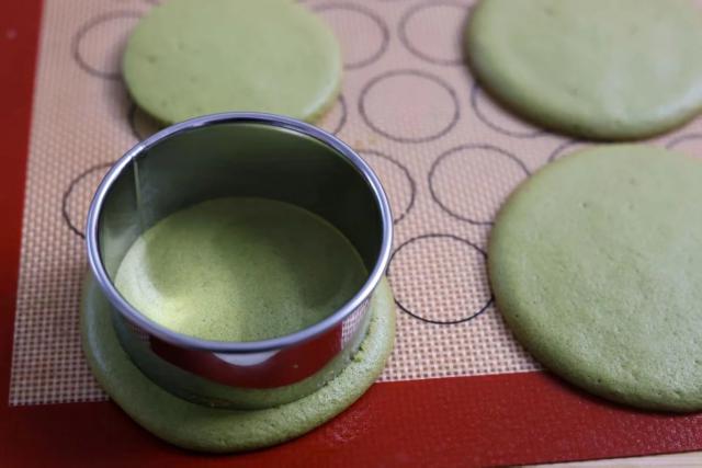 8. 用压模切圆,挤上抹茶奶酪馅。