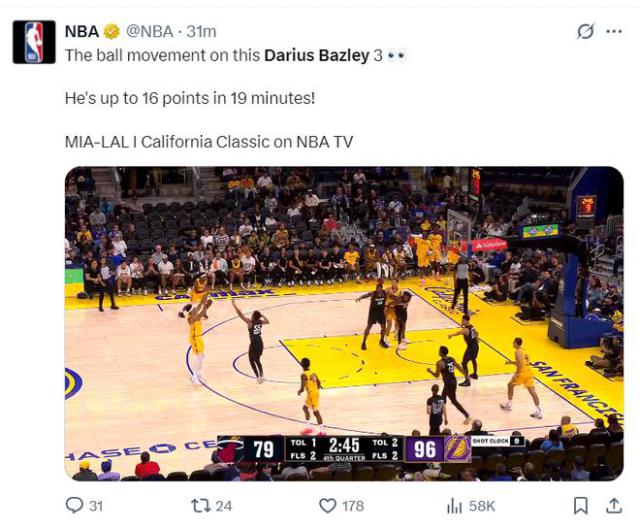 NBA官方还晒出贝兹利末节命中三分球的瞬间,并表示贝兹利短短19分钟就拿到了16分。