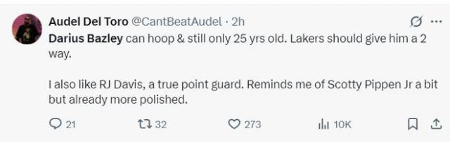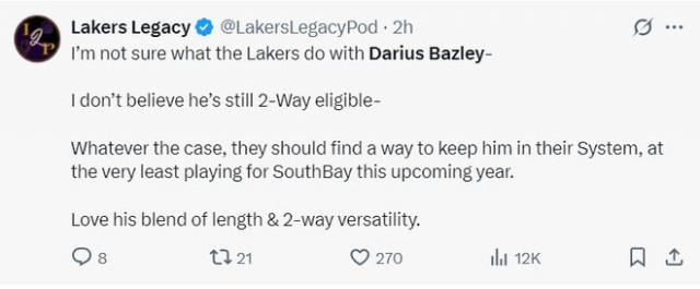 湖人球迷表示,贝兹利不仅球技出色,而且年仅25岁,湖人可以考虑给他一份双向合同。