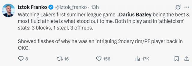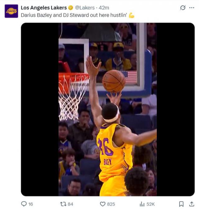 赛后,湖人队官方晒出了本场最精彩的一次防守——贝兹利的追身钉板大帽。不得不说,贝兹利的运动能力和身体天赋十分出色。