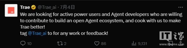 Trae官方称,正在寻找活跃的用户和智能体开发者,期望他们为构建开放的智能体生态系统贡献力量。