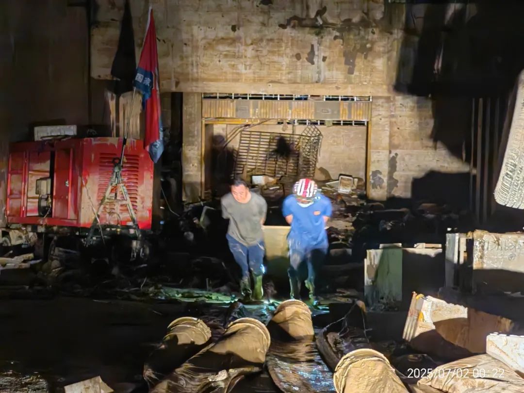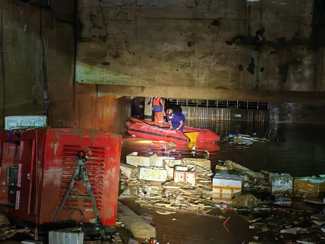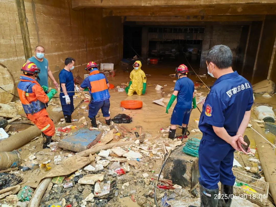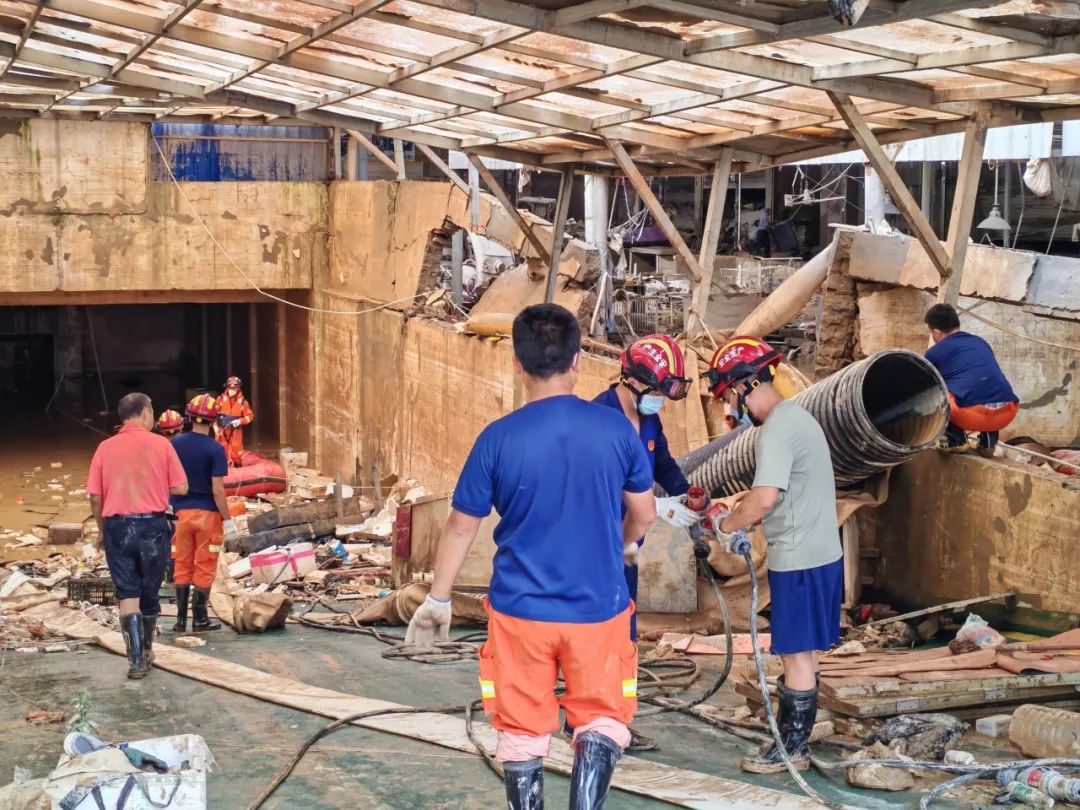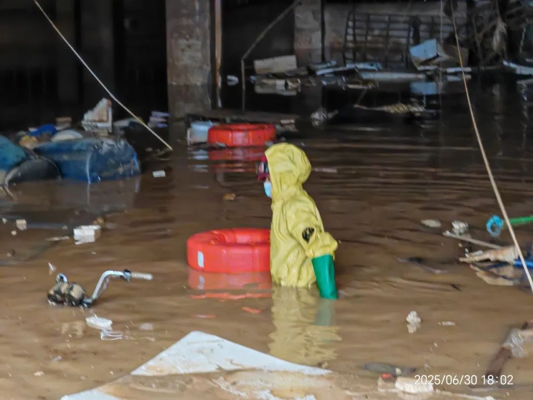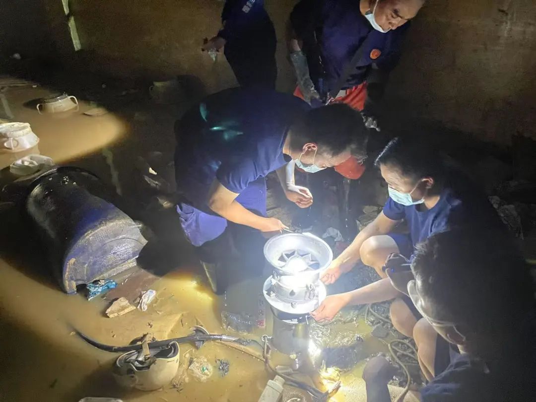 洪水倒灌后,车库里的积水混合了农贸市场的鸡鸭鱼肉和摩托车店的各类燃料,有毒有害气体和漂浮垃圾形成了“水下陷阱”。面对杂物经常缠绕水泵的情况,队员们采用“人歇机不歇”的轮班制度,频繁冒险下水清理垃圾,保证排涝作业24小时不间断进行。